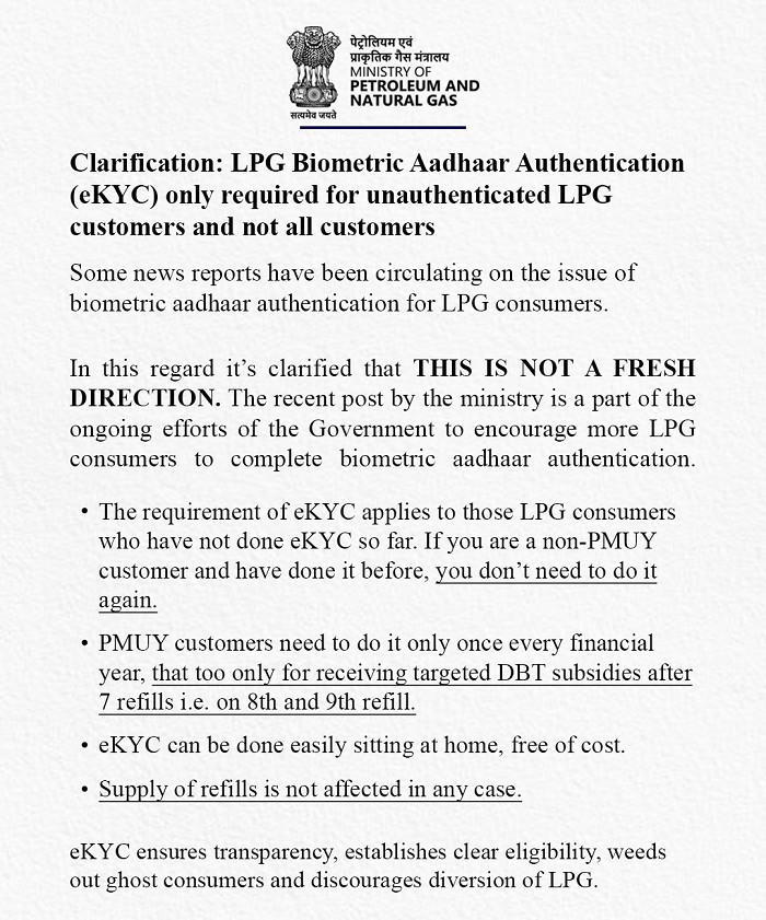 LPG Biometric Aadhaar Authentication (eKYC) only required for unauthenticated LPG customers and not all customers.